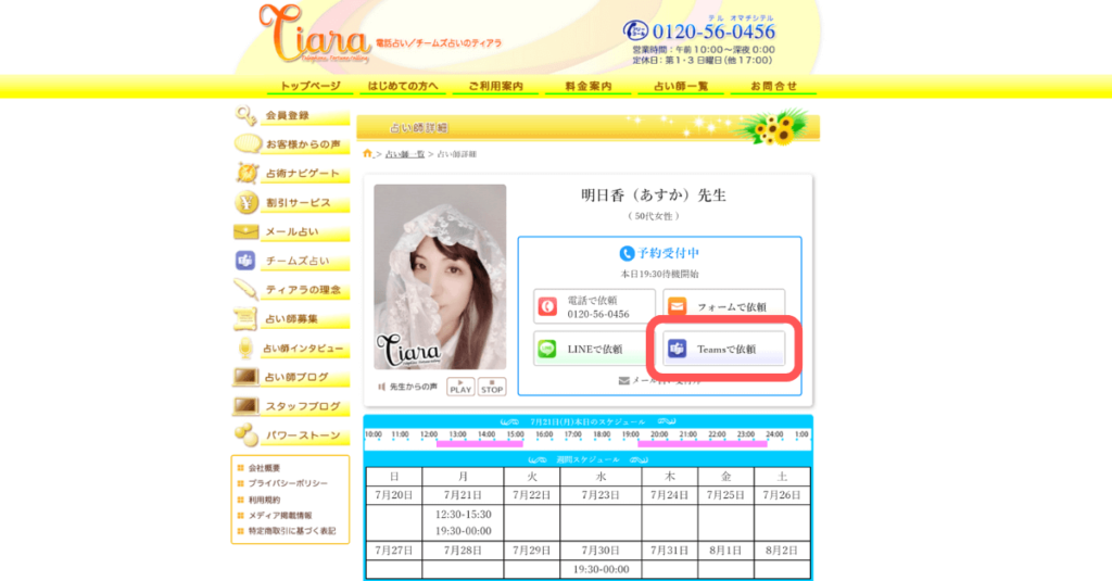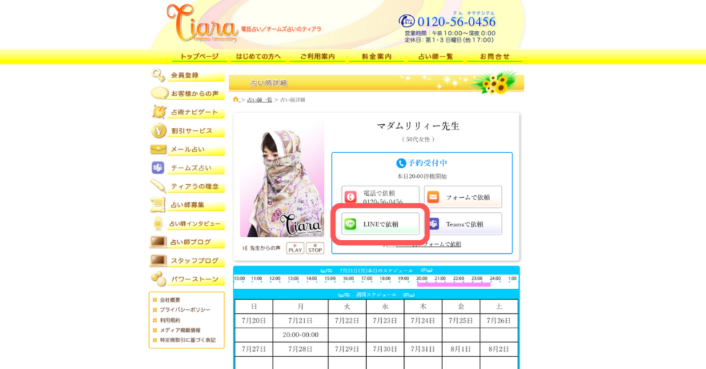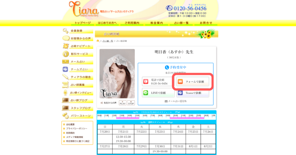 占い師のプロフィールにある「電話で依頼」をクリックします。